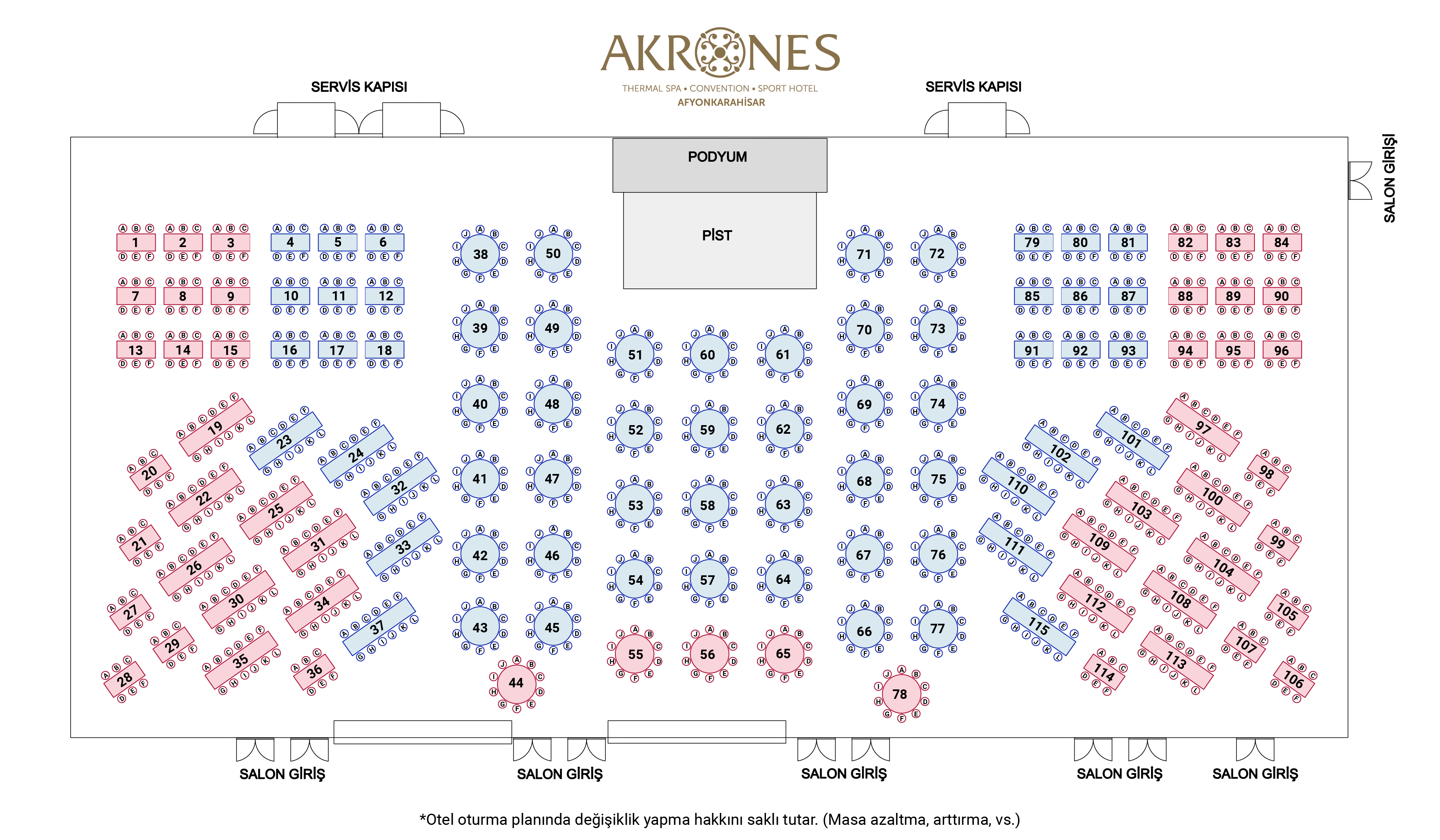 *Oturma düzeni, rezervasyon sırasında belirlenecek olup, Mavi ve Kırmızı Masa kategorilerinden oluşan plan misafirlerimizle paylaşılacaktır.